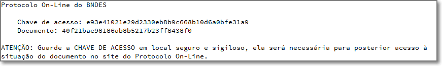 É possível, todavia, após atender as solicitações exigidas pelo BNDES, protocolar um novo documento e com isso iniciar um novo processo. Neste caso, será gerada uma nova Chave de Acesso para que seja possível acompanhar o novo processo relacionado ao novo documento.